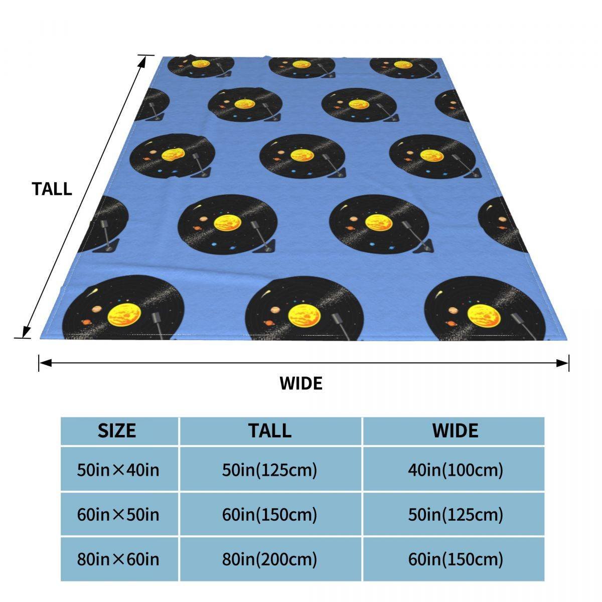 Solar System Vinyl Record Blanket. Throw Blanket. Full-width printing, single-sided printing. Made of anti-pilling flannel, for more comfort and warmth. Does not absorb any moisture. Lightweight, durable, and can be folded compactly. Super soft and feels great. Completely resist shrinkage and wrinkles. Velvety and fuzzy feeling.